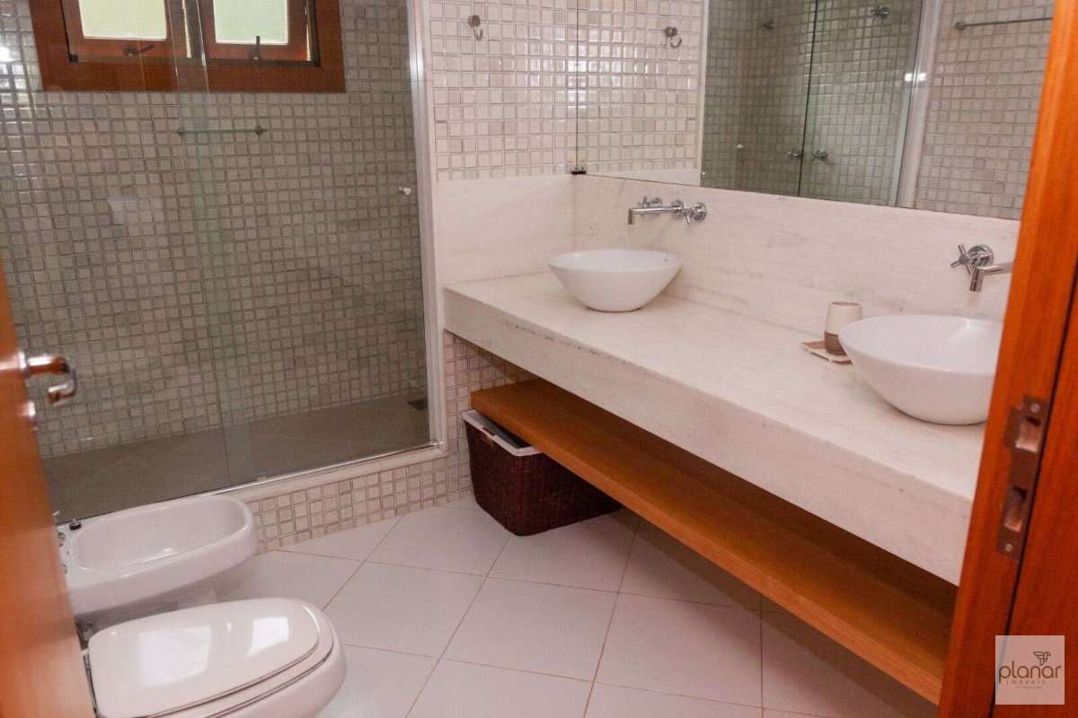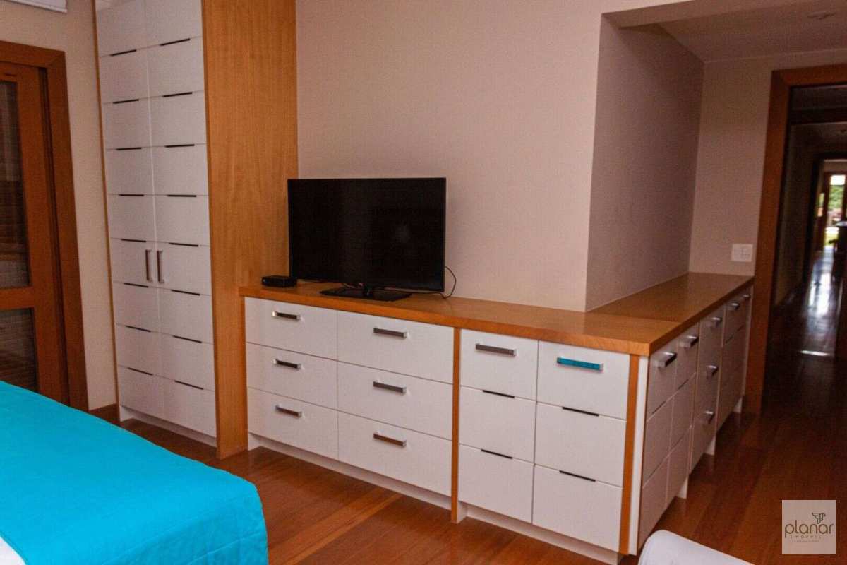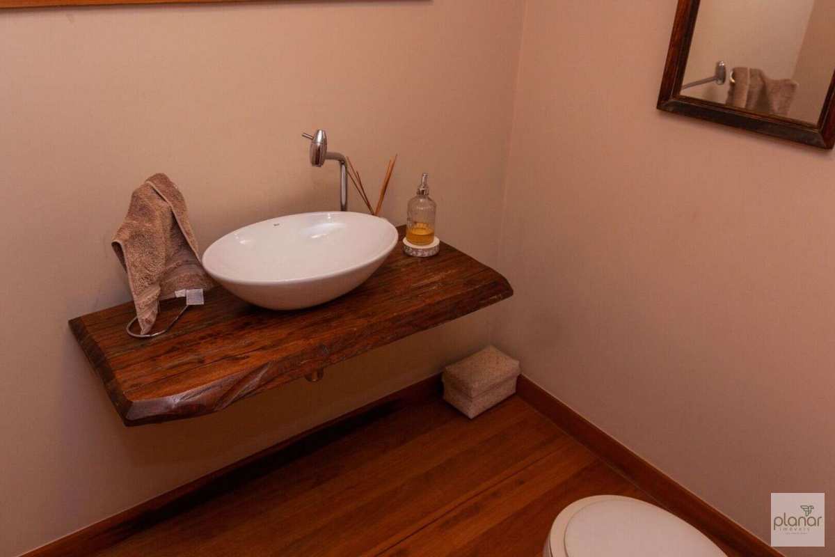 A casa principal conta com varanda, sala de estar/TV, sala de jantar, lareira, lavabo, banheiro social, 5 quartos, sendo 3 suítes (uma delas com varanda), além de cozinha e área de serviço.